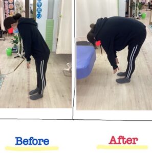 そこから、骨盤にも動きをつける関節調整も行います。これで、普段前屈で床に手が届かない患者様でも、床に手が届くようになるのでかなり驚かれます。